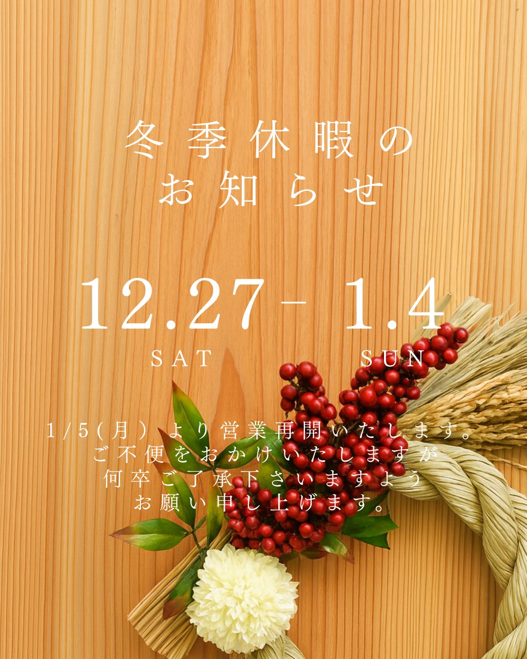このたび冬季休暇のため誠に勝手ながら下記の通り休暇とさせて頂きます 休暇期間: 令和7年12月27日(土…
