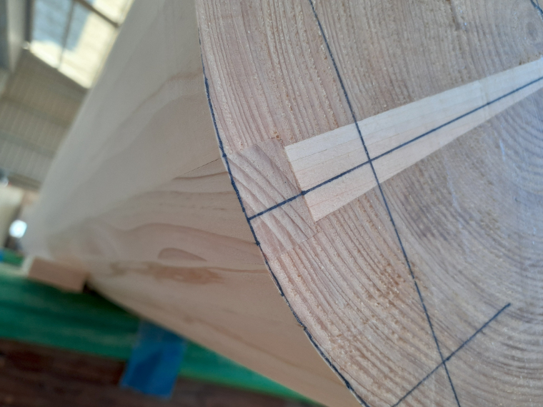 大工の手仕事|大径のヒノキ丸太を化粧柱へ。背引き埋め木で割れを防ぐ伝統技術