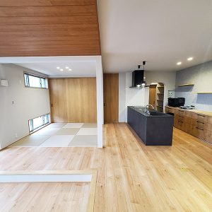 ご家族の一番のこだわりは、対面キッチンに立ちながら家全体を見渡せること。キッチンからは、和室コーナー、ダイニング、ピットリビングとタイルデッキが広がり、家族の姿をいつも感じられる間取りになっています。