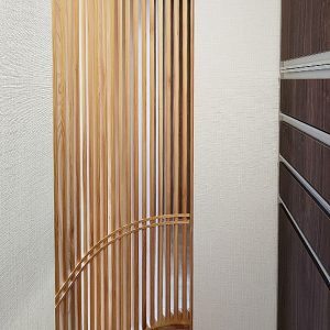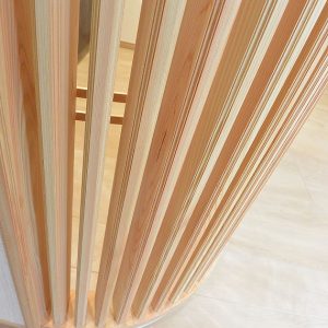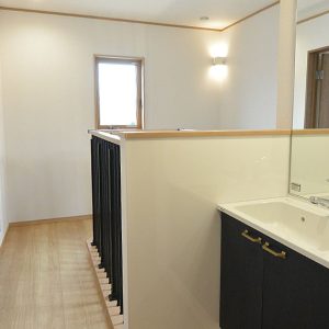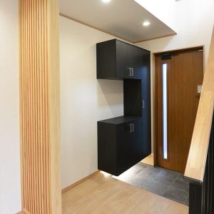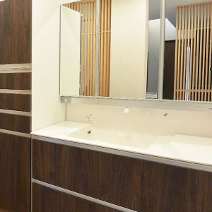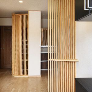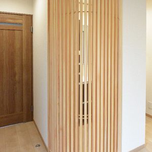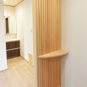 玄関からまっすぐの位置には、木格子でさりげなく囲った洗面コーナーを設け、利用しやすさとデザイン性を両立させました。細やかな配慮の中に、自然と和の趣を感じていただける工夫が散りばめられています。